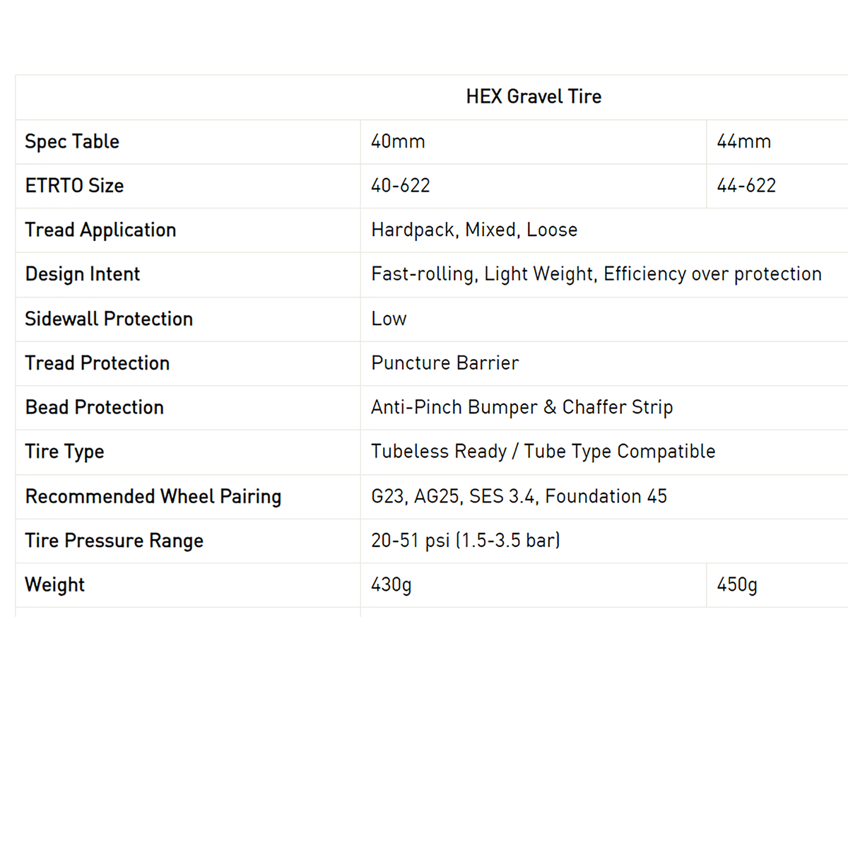Die Gummimischung des HEX, die erstmals bei den SES Race Day Straßenreifen zum Einsatz kam, ist mit Nanopartikeln angereichert, die den Rollwiderstand verringern, die Traktion verbessern und die Abnutzung reduzieren. In Kombination mit einer geschmeidigen Karkasse bietet der HEX ein geschmeidiges Fahrverhalten und eine hohe Rollleistung. Die Tubeless-Reifen sind in den Größen 40c und 44c erhältlich.